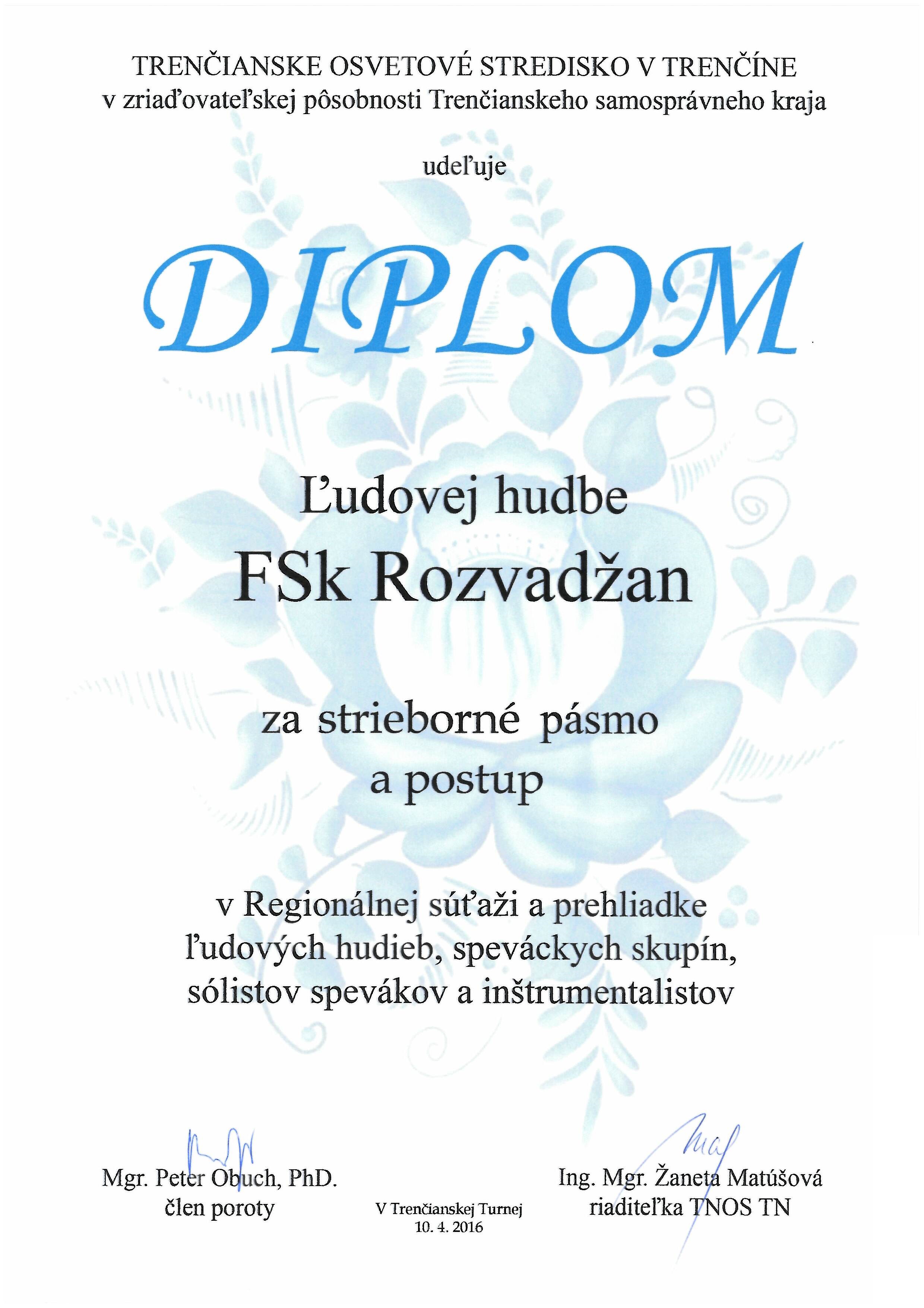 Aj v tomto roku, rovnako ako vlani, sa náš FS Rozvadžan zúčastnil postupovej folklórnej súťaže. Na rozdiel od vlaňajška sa však v tomto roku nepredstavovali súbory ako celky, ale samostatne ľudové hudby, spevácke skupiny, sólisti a inštrumentalisti. Regionálne kolo súťaže sa konalo 10.4. v Trenčianskej Turnej. Z našich zástupcov do krajského kola postúpila ľudová hudba, ženská spevácka skupina a spevácke duo.