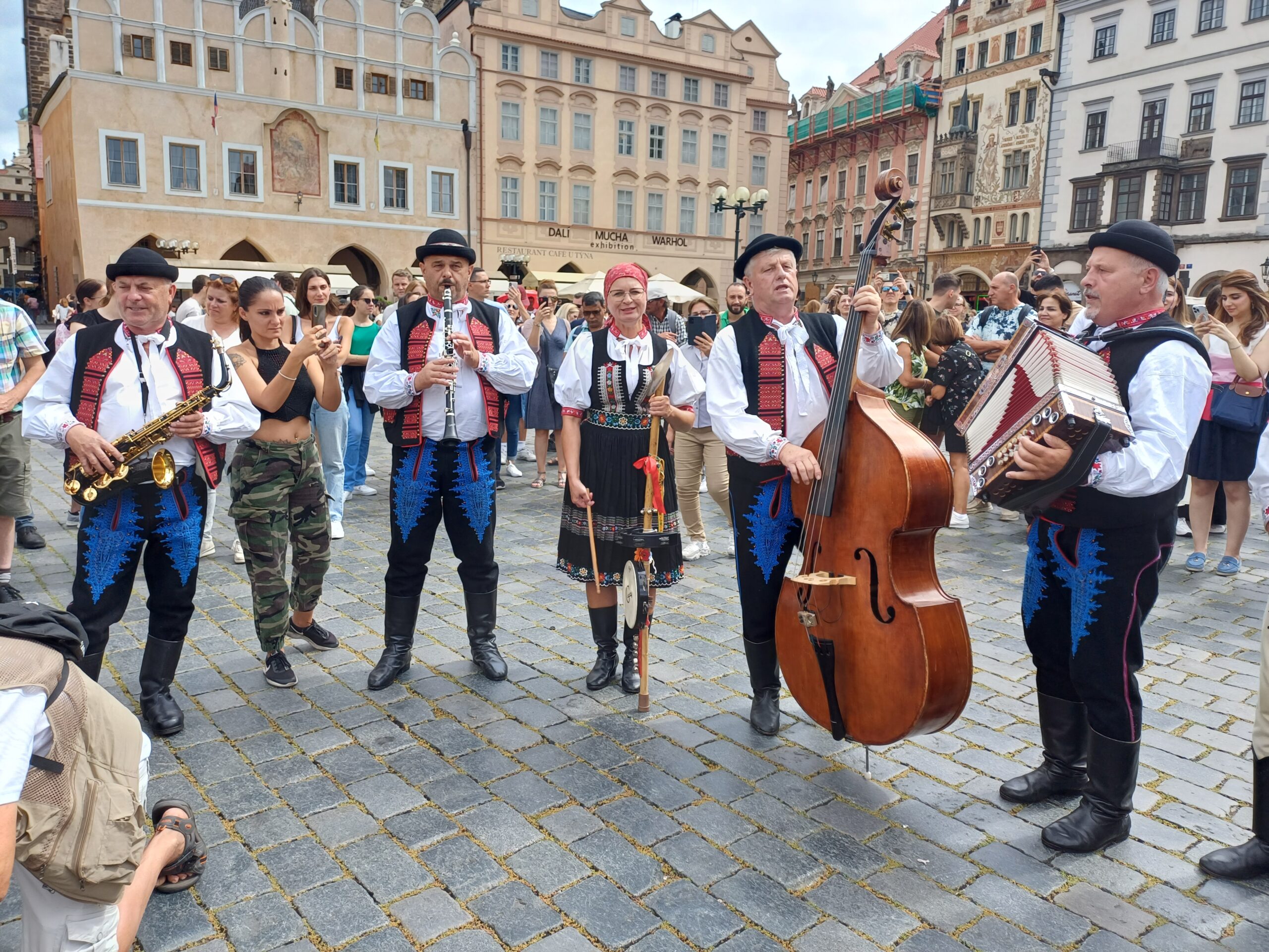 Festival pripadol na sobotu. Pred odchodom z hotela sme stihli aj generálku. Priestranstvo pred ním nám poslúžilo ako dočasné javisko a oblečené kroje dotvorili atmosféru, vďaka čomu sme ani o divákov nemali núdzu. Po nej sme sa presunuli do električky a naše kroky mierili na Staroměstské náměstí.