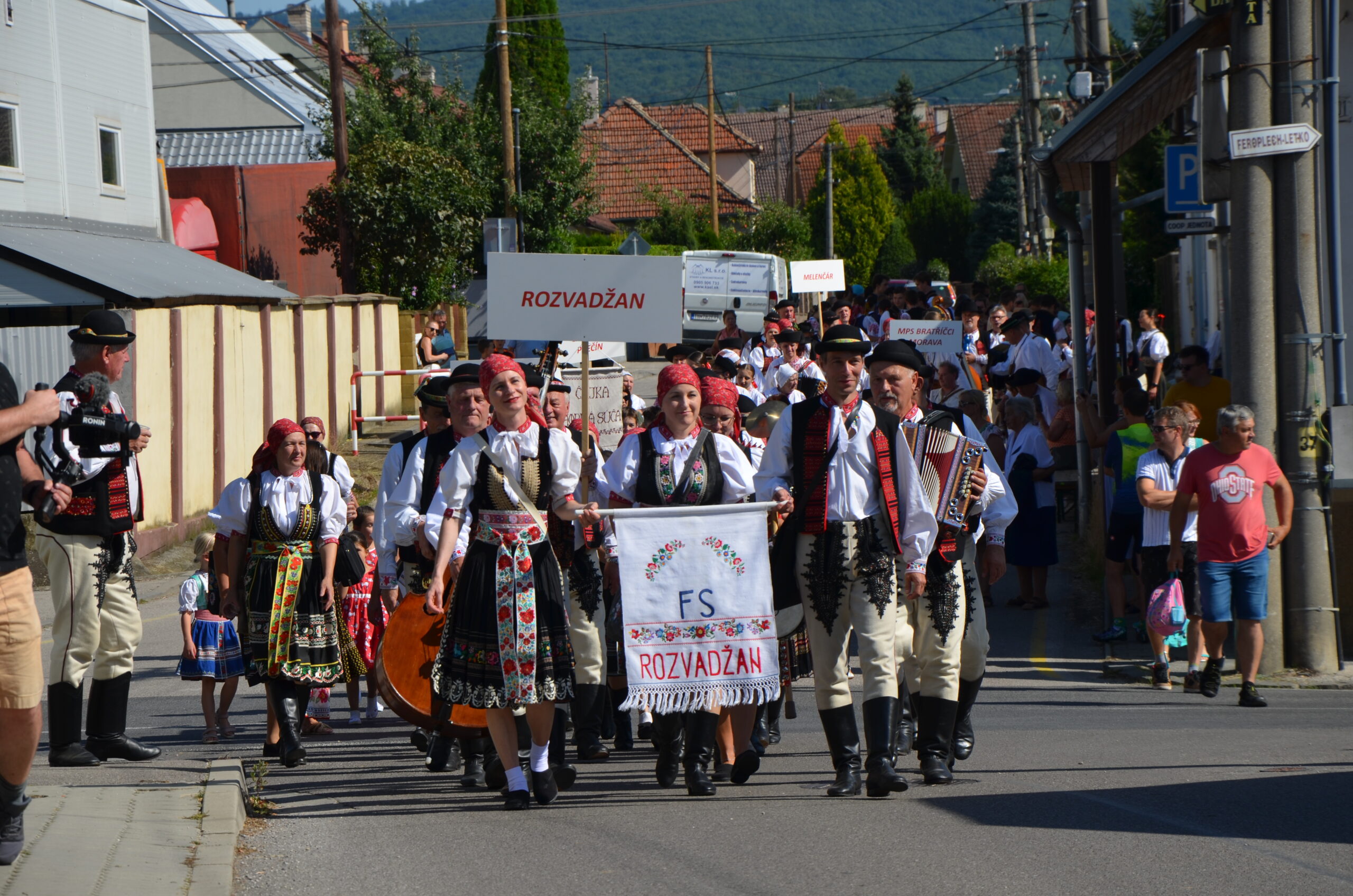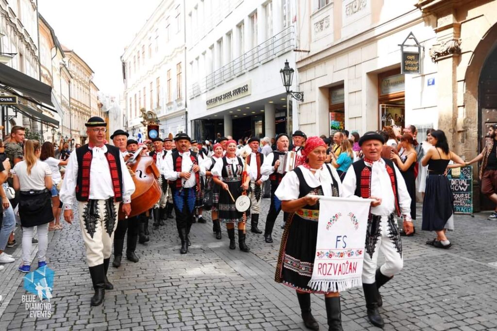 Tento rok nám počasie prialo a vďaka tomu sa mohol konať aj sprievod zúčastnených folklórnych skupín zo Staroměstského náměstí. Mnoho turistov s obdivom sledovalo folklórne či tanečné skupiny z Bulharska, Grécka, Rumunska, Maďarska a Chorvátska ako prechádzajú po historickej časti mesta. Cieľom sprievodu bol Ovocný trh, kde sa na pripravenom pódiu predstavilo 11 skupín. Novinkou festivalu bol živý prenos na platforme YouTube. Záznam si môžete pozrieť na našej Facebookovej stránke: Folklórny súbor ROZVADŽAN.